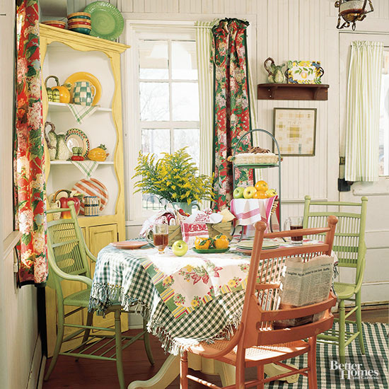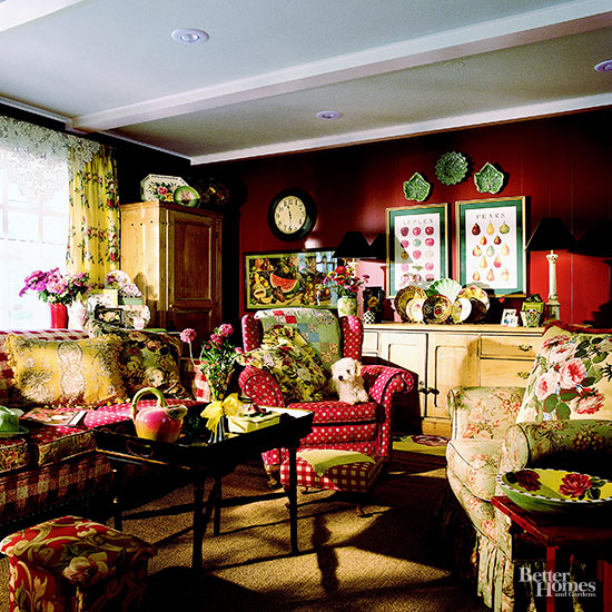 Simple curtains and drapes became extravagant, festooned waterfalls of pattern and color. Solid colored sofas were recovered in cabbage roses and stripes. Not a surface was left bare, ceilings were embellished with bold ginghams, tabletops layered in tablecloths, and set with vases full of silk flowers. Knick knacks covered every available surface. Walls bordered in papered or painted designs. Mixing and matching colors and patterns and creating themed rooms was all the rage.