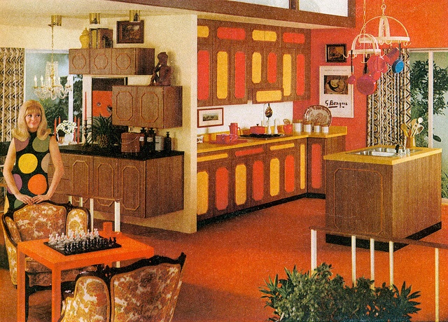 You’d find kitchen tables with brightly colored vinyl seats, long sofas made for stretching out on. Piles of pillows for lounging and listening to music. Lava lamps. The latest in technology, dishwashers started popping up high-end homes, dimmer switches allowed for mood lighting, telephones in multiple rooms instead of one central location.