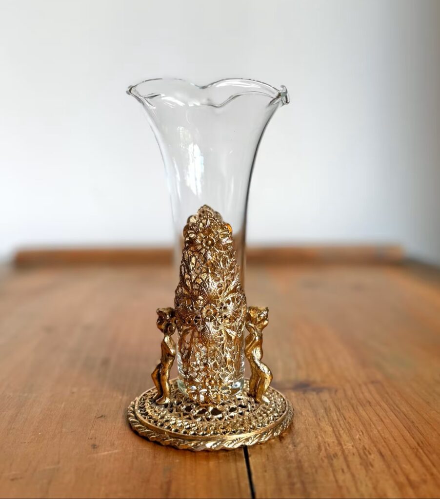 Add a dramatic glass vase to an assemblage on a shelf with photos, books and trinkets