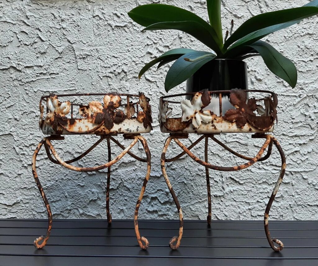 Place a large plant in an ornate antique pot holder on a porch