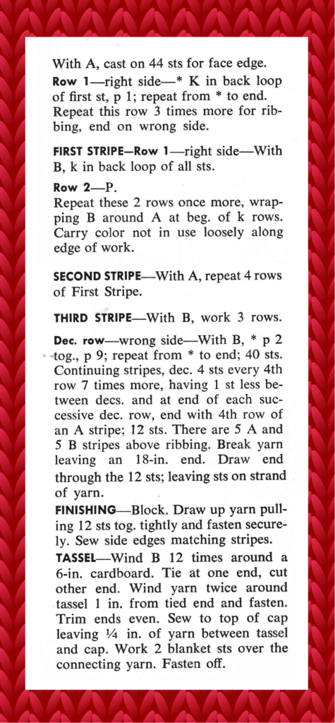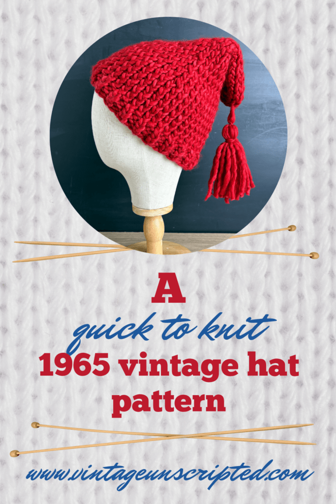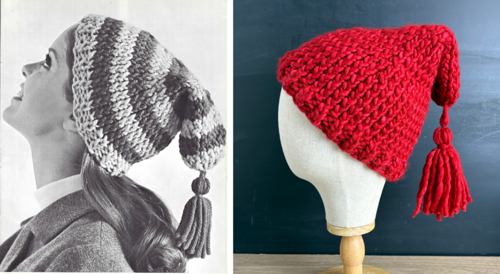I spent some quality time with my collection of vintage knitting booklets looking for something cute, jaunty and easy so I could peacock around wearing it in short order. This particular vintage hat pattern met those criteria. It’s knit with BIG yarn on BIG size 15 needles It has a tassel. It has a combination elf/pixie/pirate vibe.