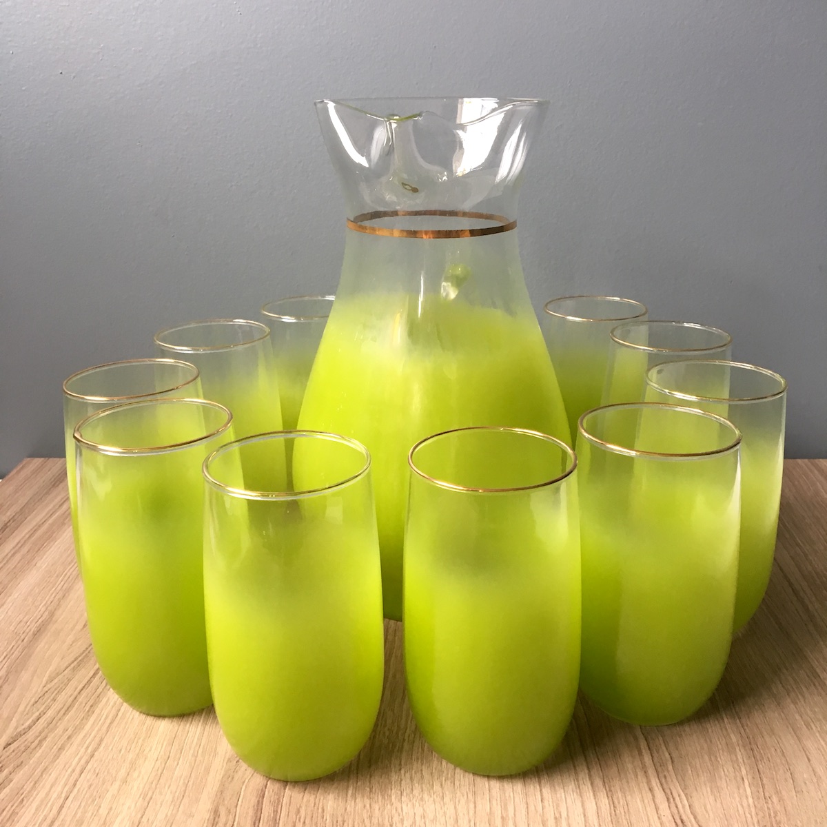 Made in the 1950s and 1960s by the West Virginia Glass Company, Blendo was a staple for year round entertaining. But it was and is at it’s best at a backyard barbecue. The pieces are functional, practical and sturdy and have a band of gold on the rim to give it a tiny splash of luxe. Pitcher and glass sets in a variety of shapes and sizes are the most common pieces. Next in popularity are the chip and dip bowls, followed by salad bowls and small condiment servers.