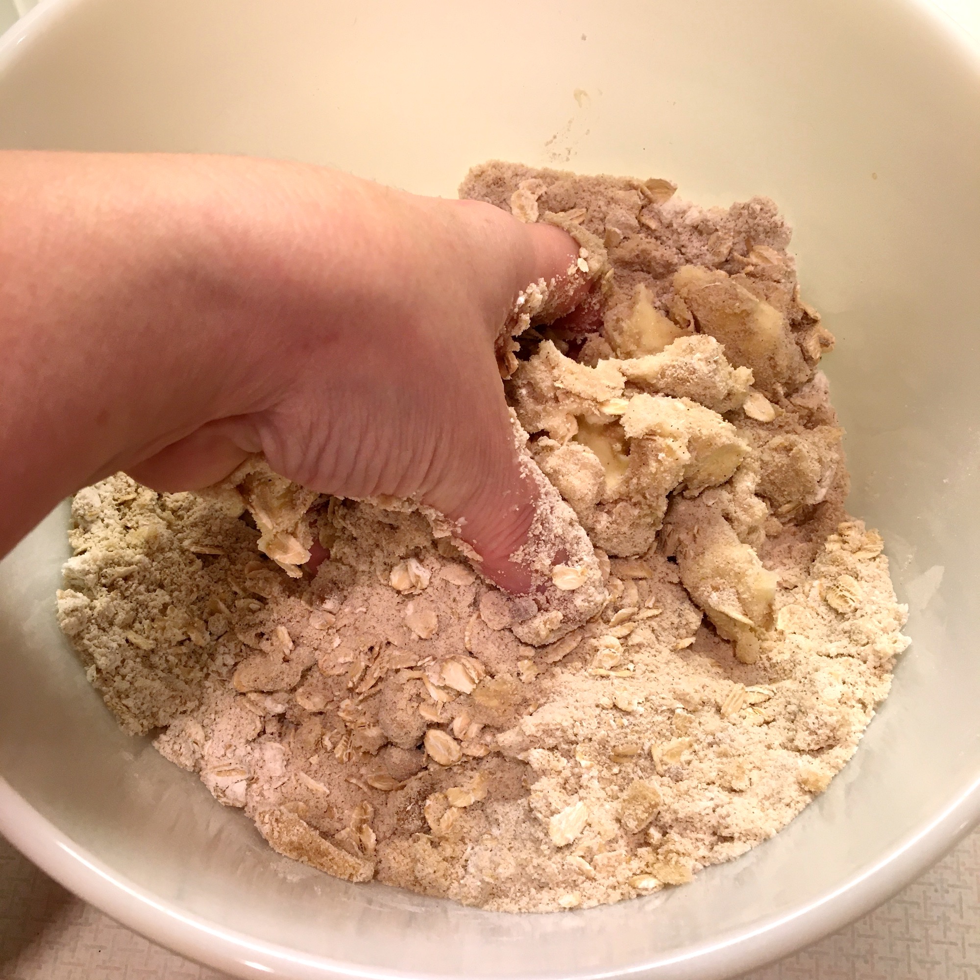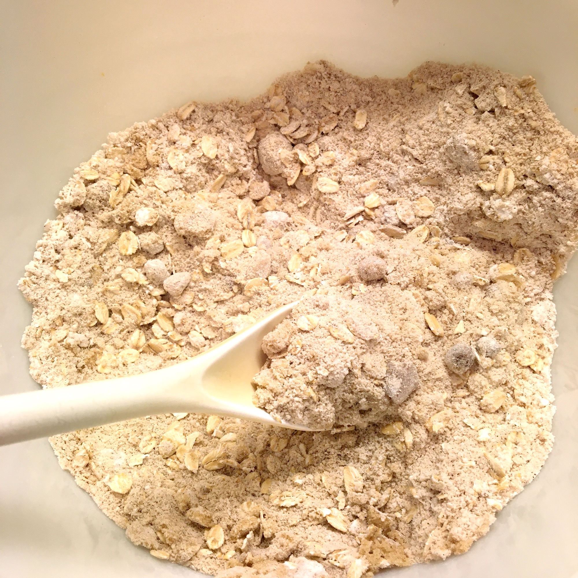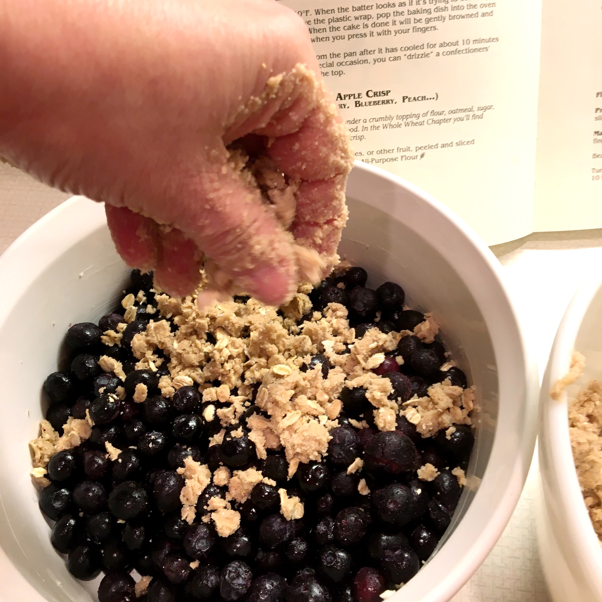 Blend the dry ingredients. Rub in the butter with your fingertips until the mixture is crumbly. Sprinkle the crumb mixture over the fruit. (Keep it light, don’t pack it down.)
