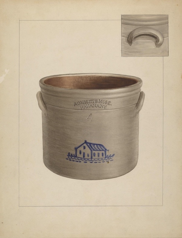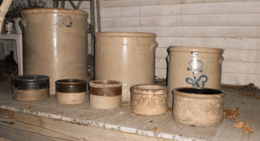 American pottery crocks can be found in different parts of the country. Each area created their own signature styles based upon the type of clay in local regions and intended usage. In farming areas, crocks were used as storage for corn, wheat, oats and other crops. In other parts of the country, ,jugs were made to store vinegar, liquor, water and other liquids. There was a plethora of butter crocks and pickling barrels as vegetables.