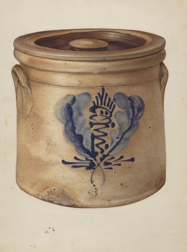 The New England area was known for salt glazed crocks. Salt glazing is a technique where large amounts of salt are thrown into the kiln during firing to create a glaze, making the pottery impermeable and giving it a glossy finish. Norton Pottery began in 1785 and remained in the same family until 1894, at which time the final descendant owner passed away and the business closed. Edmands Pottery was a Massachusetts company begun in 1812 by Barnabus Edmunds and William Boroughs. The company was one of the largest in the area and remained in business until 1905.