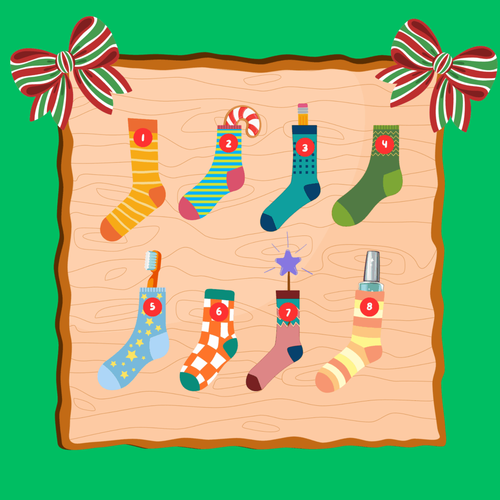 Paint a board or large cardboard rectangle and attach colorful socks, each one numbered and filled with a tiny gift.