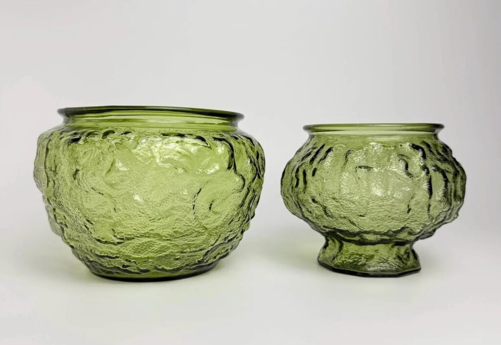 Like Napco, which did not actually manufacture any of its pottery, E.O. Brody launched with just four designs, designed by them but pressed by Indiana Glass (and possibly other American makers). E.O. Brody owned their molds, but never made their own glass–they commissioned the products and sold the products but didn’t make the products. Ceramic vases and planters were also made for Brody both in the US and in Japan.