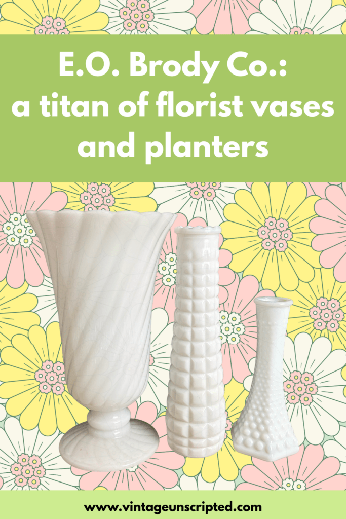 If you collect milk glass or vintage glass vases, chances are you’ve seen a piece embossed with E.O. Brody Co. on the base. This is not surprising, because for 30+ years the company was one of the world’s largest suppliers of wholesale vases for florists. There are scads of Brody vases out there, and that’s a good thing because they are lovely.