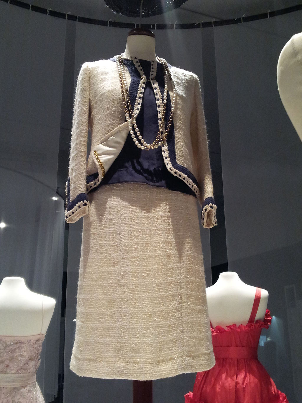 From the September 2023 – March 2024 Gabrielle Chanel. Fashion Manifesto exhibit at the V&A Museum, South Kensington, London. From left, 1916 Marinierè blouse, 1932 dress, 1964 suit.