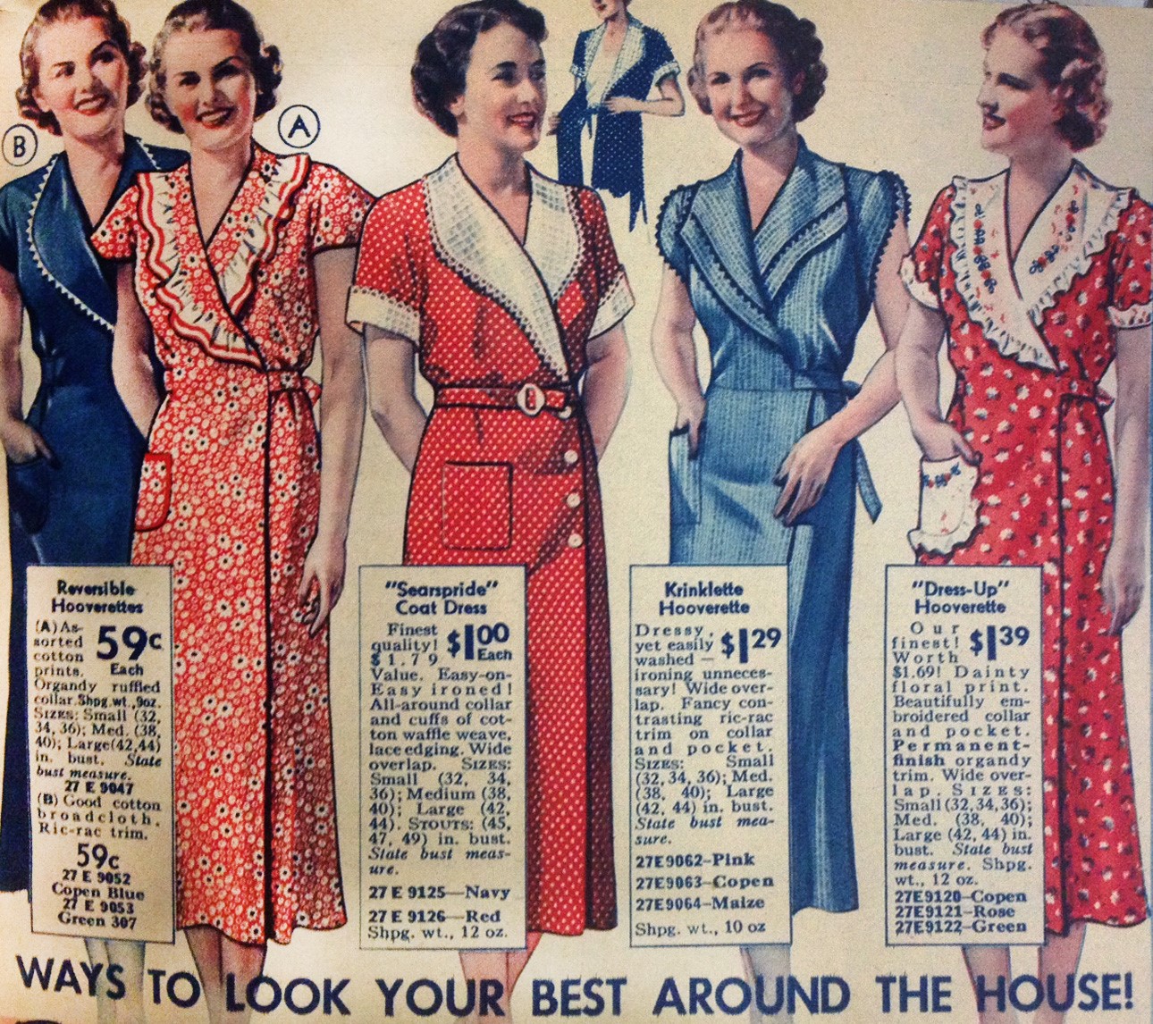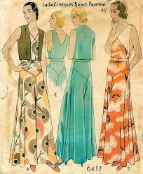 When not out on the town, women of the 1930s wore cotton floral house dresses at home and had begun to wear pants for sporting occasions. The popular beach pajama look of extra wide-legged soft jersey pants with attached or matching loose-fitting tops was extremely popular.