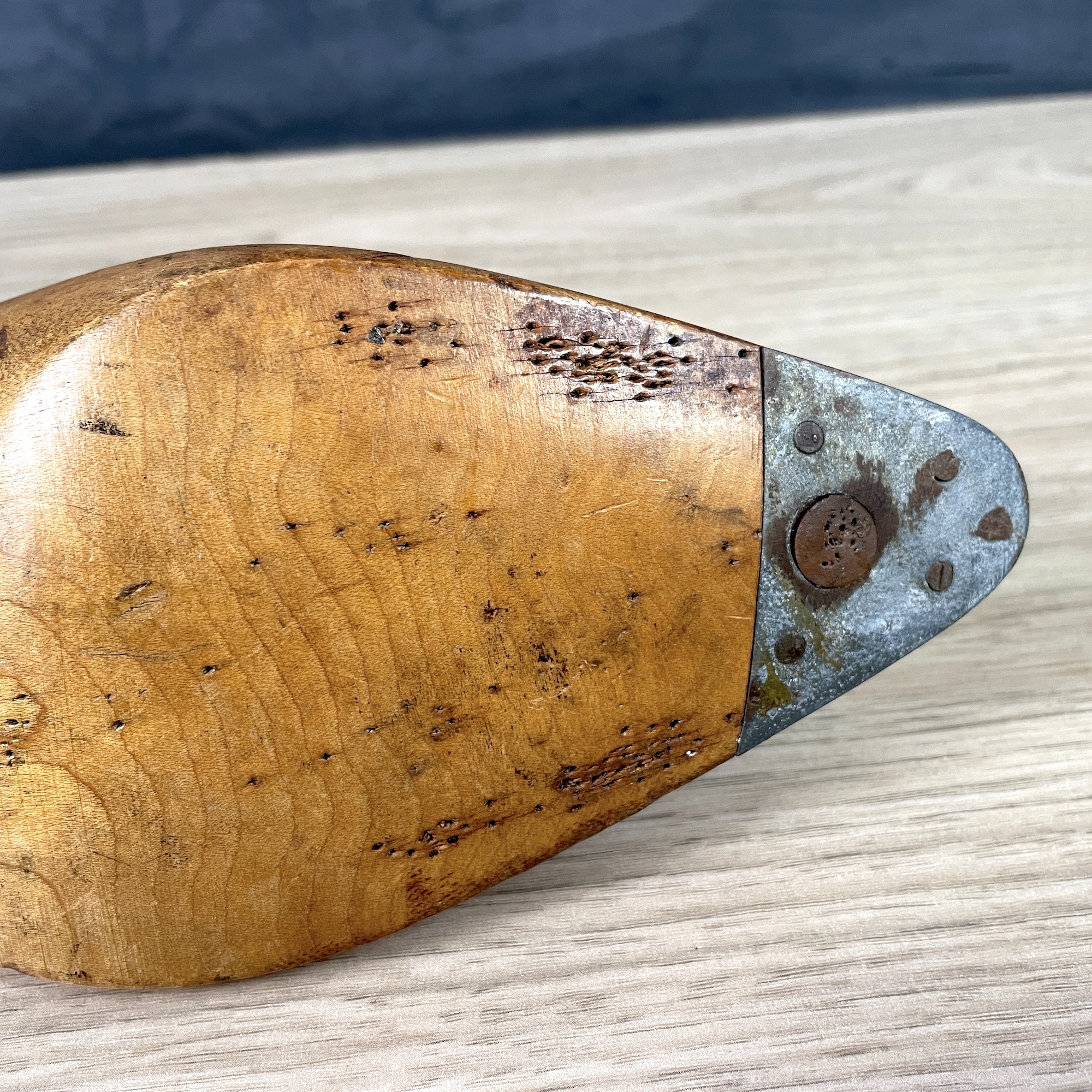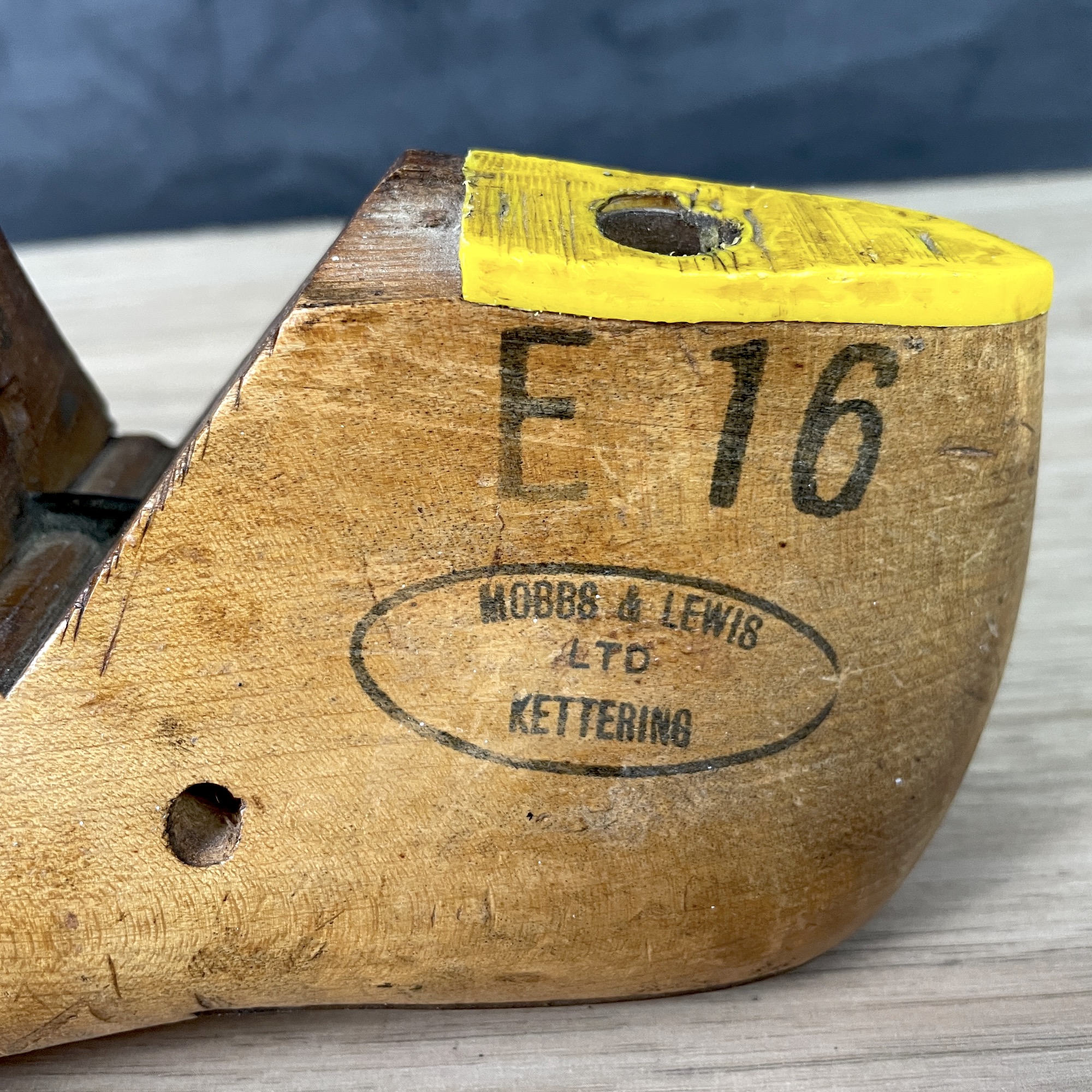 Shoe lasts are essential to cordwainers, aka shoe makers. They are used to shape the top of the shoe, to stretch the leather and tack it in place for the sole to be added later. The tack holes on the bottom of wooden lasts are how you can tell a true last from a purely decorative one. This last, with Mobbs & Lewis stamped on the side, raised the question of whether the company was a shoe maker or a last maker. It turns out it was a British company that made both iron and wooden lasts in the 20th century.