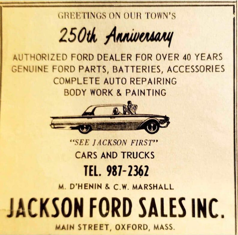Sometimes it takes a village. I acquired this beauty of a license plate topper from a moving sale, and knew I had a great piece of automobilia. I contacted a friend who lived in Oxford, MA and asked if she knew anyone who remembered this car dealership. She is in a neighbors group on Facebook, posted asking if anyone remembered Jackson Ford Sales, and within minutes I had an answer and a 1963 advertisement image from that amazing group! She said they were excited to help and began to post to their group about it. I got what I needed, and I guess they got a great discussion about the car dealership and more. This is what I love most about local history.