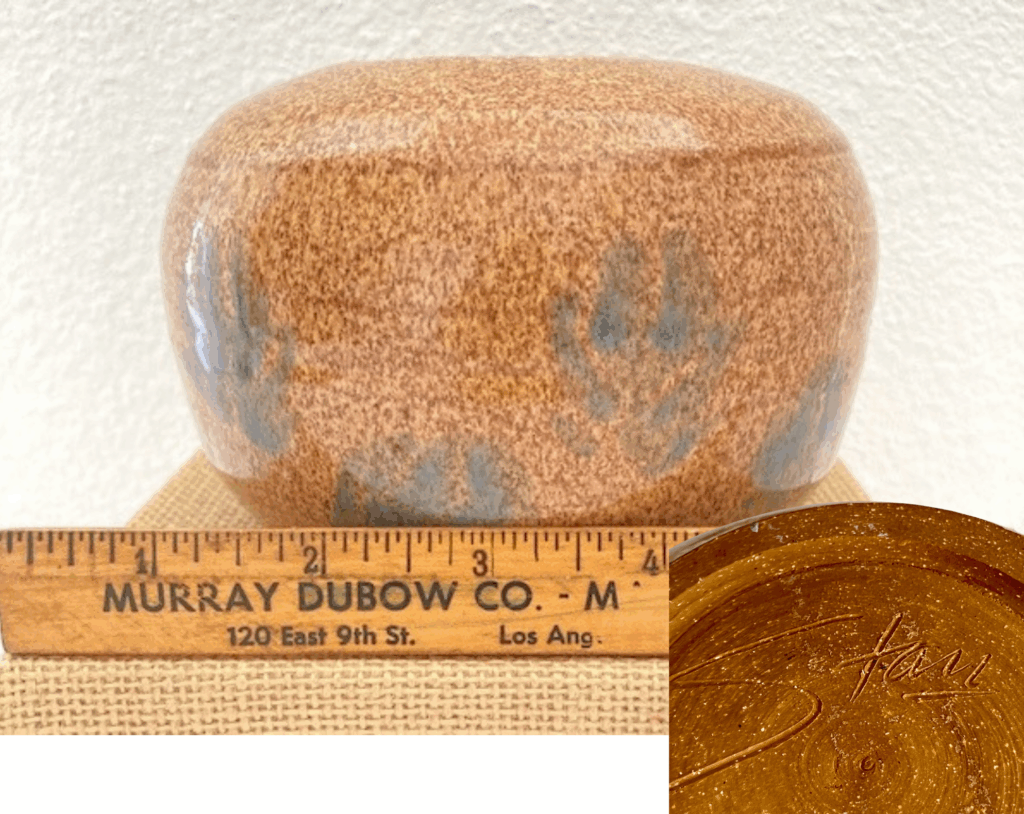 Artisan craft fairs started rising in the late 1960s and were at peak popularity in the 1980s and 1990s, meaning now, decades later, fine crafts are starting to work their way into the vintage marketplace in noticeable volume. Many pieces are by small makers, so even though there may be a signature like on the vase below, it’s nearly impossible to identify that maker now. Larger volume makers who identified their products with more than a squiggly signature can often be found and noted. The identified pieces are usually more expensive than the beautiful but unidentified pieces because that maker is more likely to have collectors.