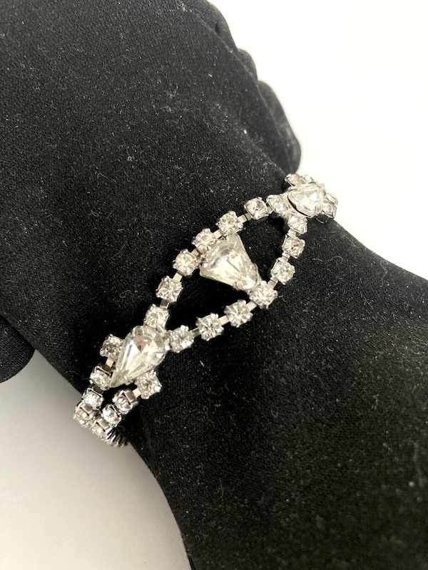 Thanks to Marilyn Monroe, Elizabeth Taylor, and a plethora of other mavens of 1950s and 60s Hollywood, rhinestone jewelry was not only popular but affordable. This style of bracelet came in many variations with the centerpiece taking several forms. Some were marked, others were not. This bracelet has no markings but was clearly well made and cared for as the stones are all intact and still bright and clear. Just the right amount of bling for a night out or to wear to a party.