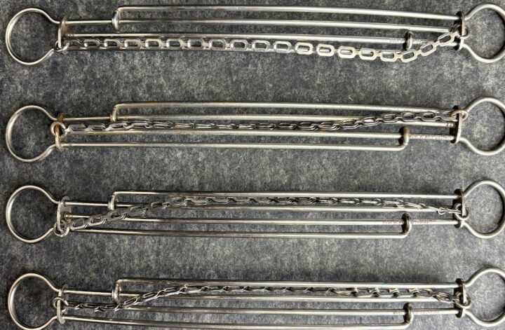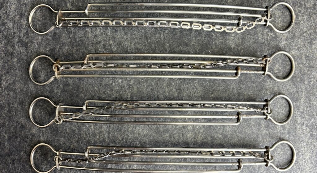 This set of four expandable travel hangers is, to this adult, endlessly fascinating. It slides open, it slides closed. It slides open, it slides closed. The patent number is not given, but a patent date of 1908 is. These hangers have chains instead of hooks. I have two thoughts about that: the majority of travel was done by train, and trains were more likely to have hooks than bars for hanging. Also, many wardrobes and closets were outfitted with pegs or hooks instead of bars.