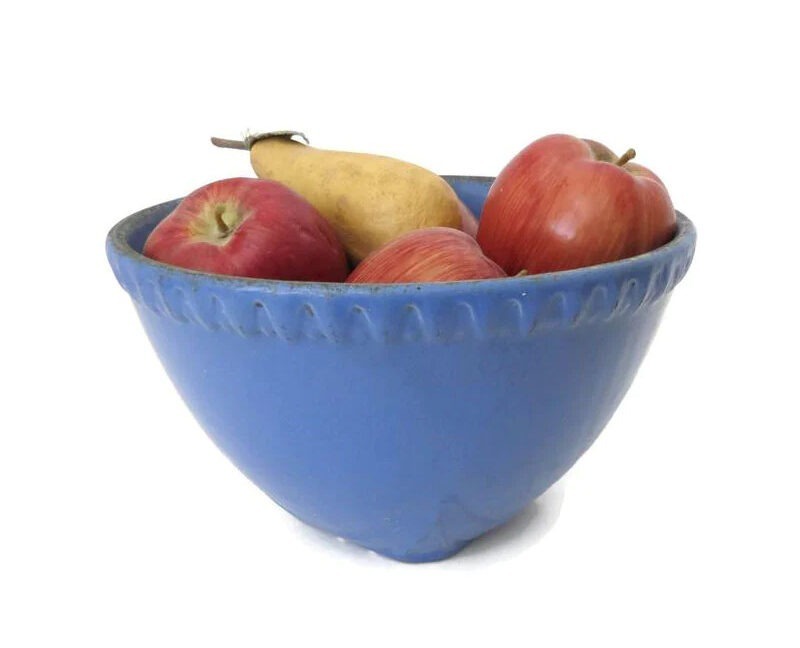 Offering an unmarked stoneware mixing bowl that dates to the 30s. The loss of glaze around the lip and on the interior says to me it was a “go-to” bowl when it was new.The bright blue color and the impressed design around the lip and base make it a standout fruit bowl in a contemporary kitchen.
