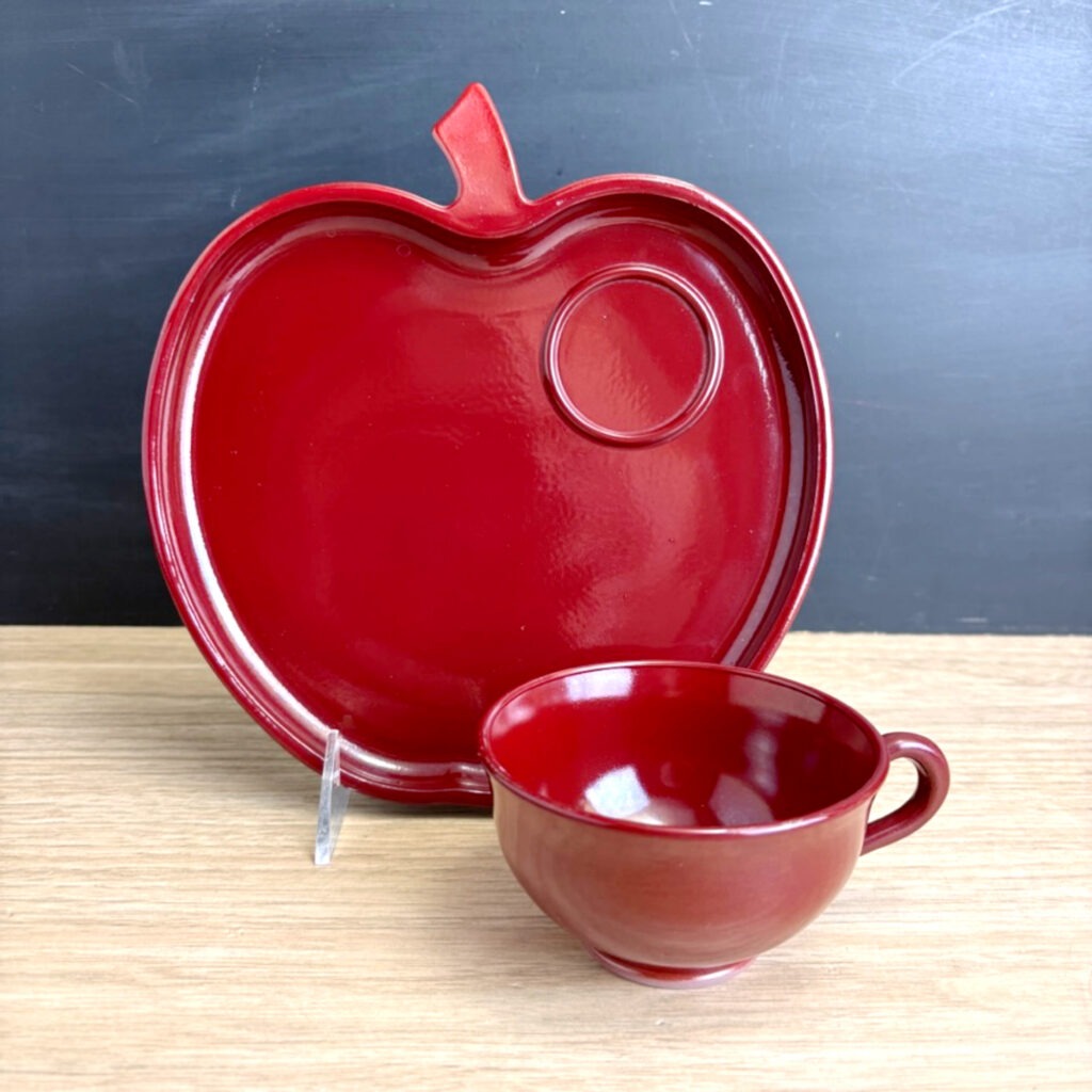 This Hazel-Atlas apple snack set is made from their Platonite milk glass with a burgundy fired-on finish. Platonite was Hazel-Atlas’s proprietary opaque white glass, used for tableware from 1936 through the 1950s. It was sturdier than regular milk glass, yet more lightweight and also more heat resistant. From the manufacturing perspective, it provided excellent adhesion for decorating with fired-on finishes, gold banding and decals. For vintage lovers, it’s a tableware classic.