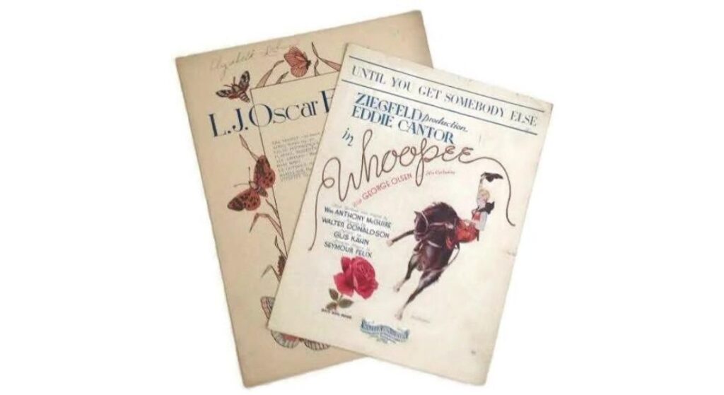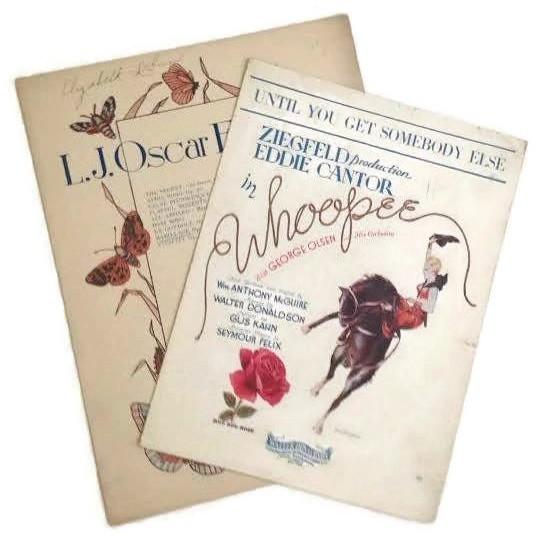 Two pieces of vintage sheet music including: “L.J. Oscar Fontaine” – 1911 – Beautiful butterflies grace the cover in shades of rust, gold and blue and “Until You Get Someone Else” – 1928 – from Ziegfeld Production starring Eddie Cantor in “Whoopee”. Complete in decent vintage condition. Suitable for framing. Colors are good and the graphics are nice.