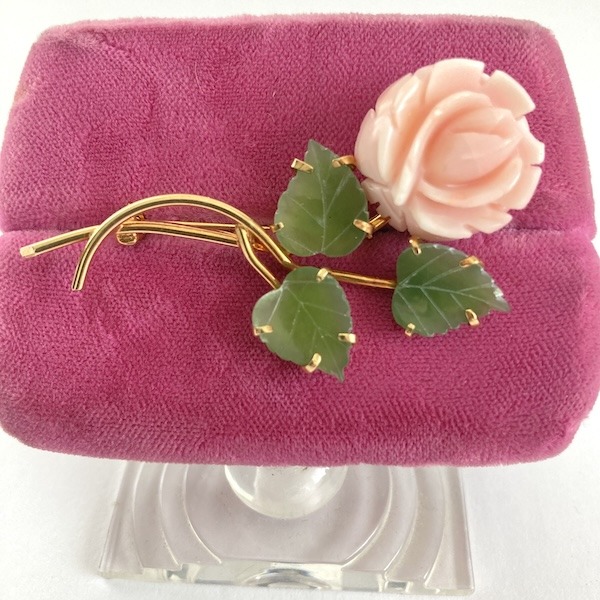 A single rose historically symbolizes a new love relationship or love at first sight. If you happen to have a new love, this may be just the right gift. There are many version of this brooch, proving the popularity of the design. This one is carved of faux coral and stone to look like jade.