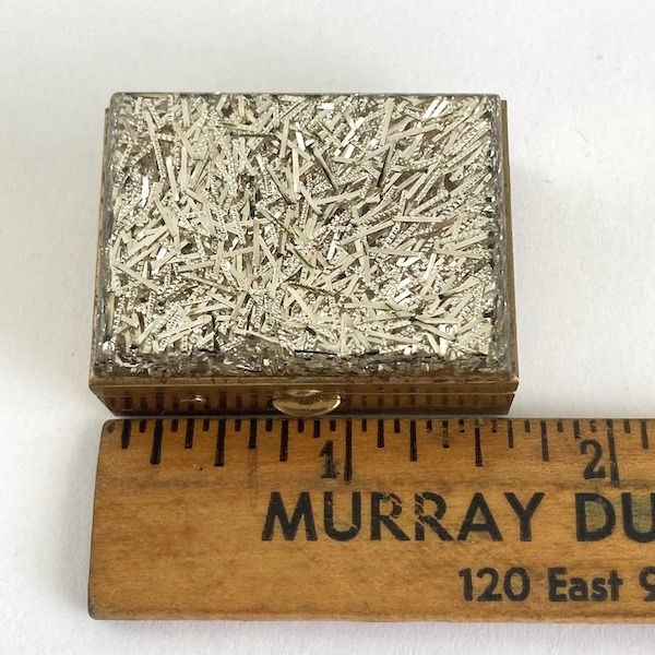 Have you ever tried to find something at the bottom of a large purse? Organization is key to finding those small items. This tiny 1950s pill box might help. Its shiny silver confetti top will sparkle in the depths of even the largest bag, making it easy to find. Just the right size for a days supply of meds or emergency allergy or headache pills. Keep it stocked as you never know when you may need some relief.