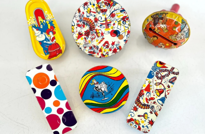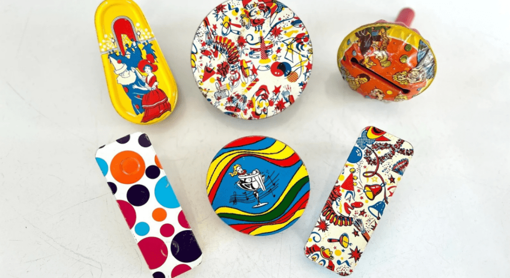 Six 1950s-1960s Metal Litho Noisemakers , $36