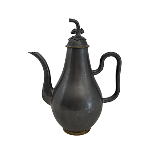 Offering a decorative vintage metal pitcher trimmed in brass and topped with a stylized acorn stopper. Marked “Made in Hong Kong” on the bottom, which indicates it was made for export after 1891. I purchased it in 1971 when we lived on Guam, so I believe it dates to the 1950s or 60s. I spent a bit of time trying to figure out what metal it is made of. Beyond the obvious (is it magnetic?), it’s not that easy to know for sure, but based on this article by Crystal Vogt written for Hunker, my money is on pewter. If anyone thinks differently, please let me know.