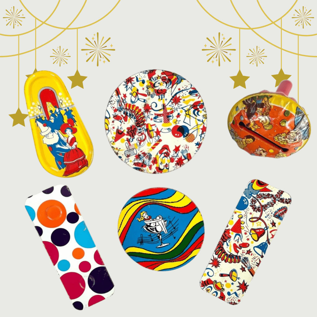 Metal litho noisemakers for New Year’s Eve are a vintage essential. Whether they shake, ratchet, toot or clang, they make enough of a racket to chase out any bad vibes from the previous year and welcome in good vibes for the upcoming year.