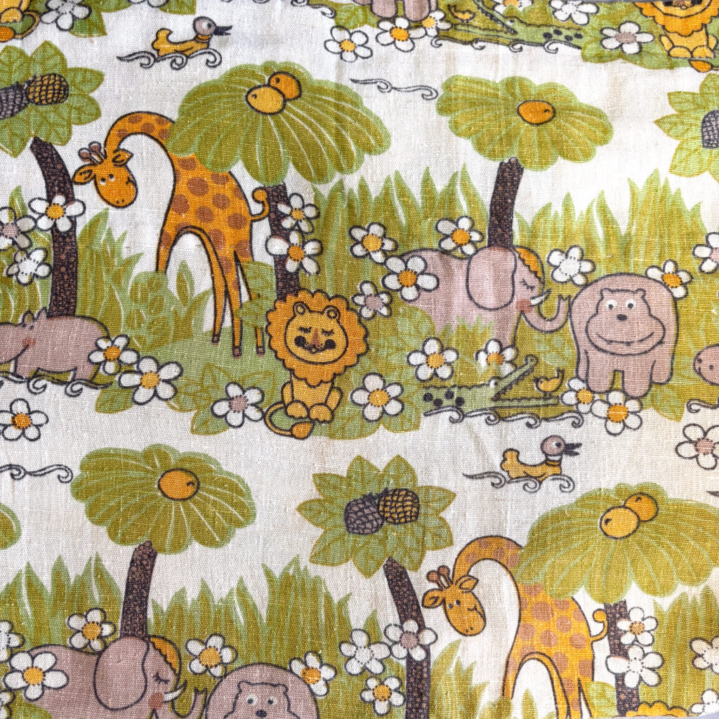 This 70s safari animal print fabric comes in three panels that appear to have been used for some kind of window treatment, but are ready to be upcycled into something new. There are no markings on the selvedges, so we don’t know anything about the maker, but it has a Scandinavian feel. It’s a loose weave, probably a cotton linen blend. There are some flaws, but they would be easy to work around. Imagine how cool this would be in a kid’s room or nursery. Or, if you have some Fraulein Maria in your veins, you could make it into play clothes for all the Captain’s children.