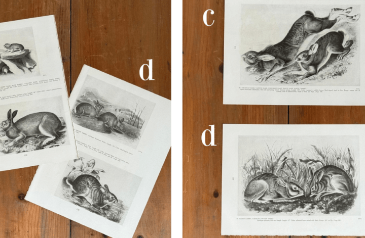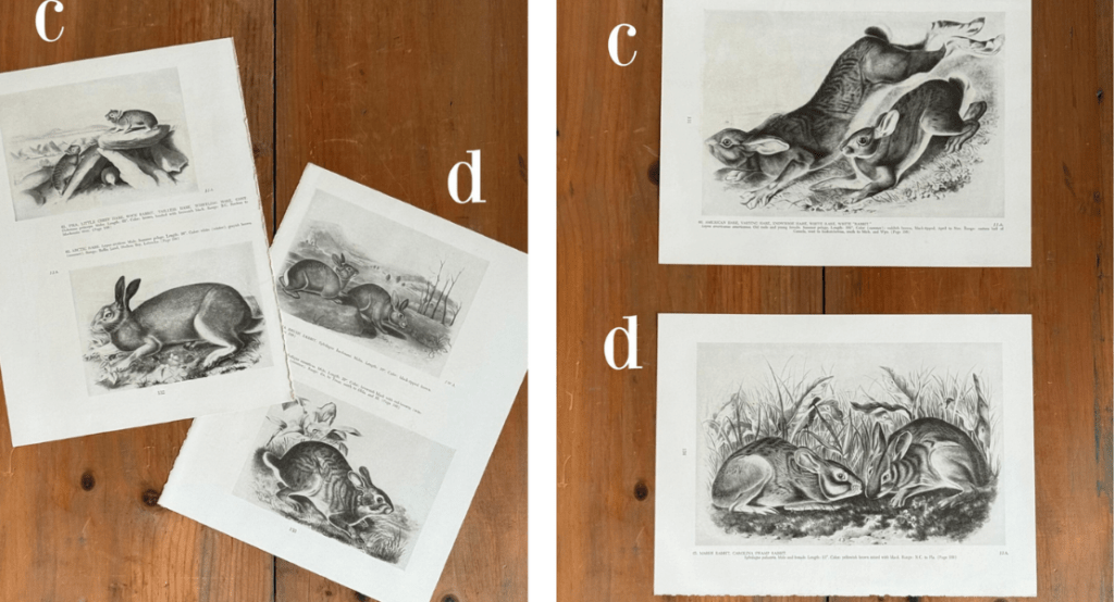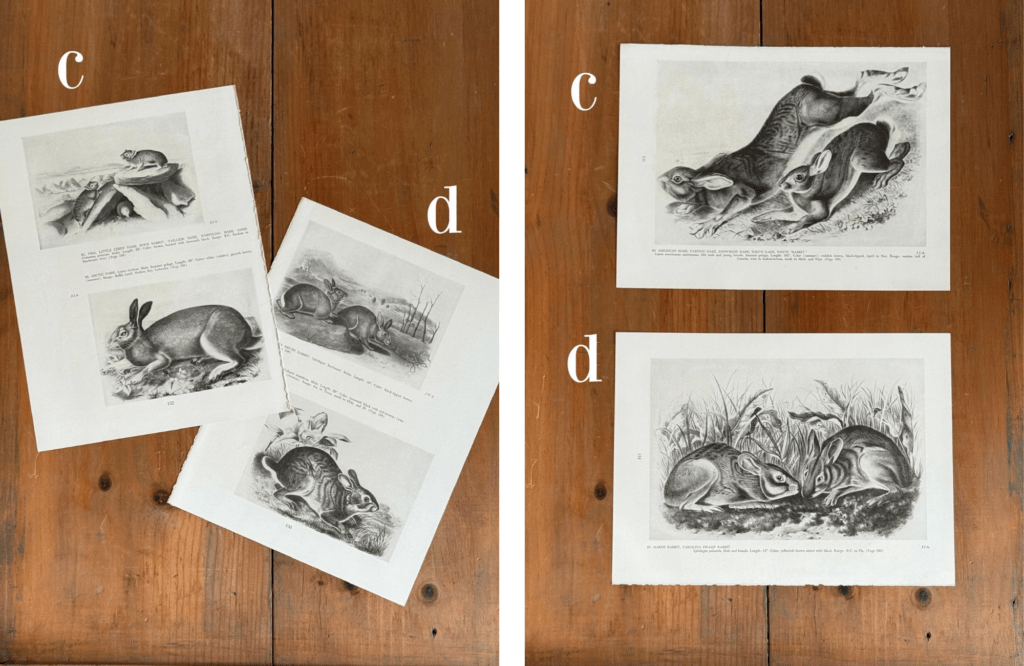 Rabbits are considered lucky, which is an excellent reason to find a place in your home for these black and white Audubon book plates from a 1954 book. Sold individually, each page is on coated stock and has two images on front and one larger image on the back. Get yourself a 9″ x 12″ frame, and flip the image over any time you want a fresh look.