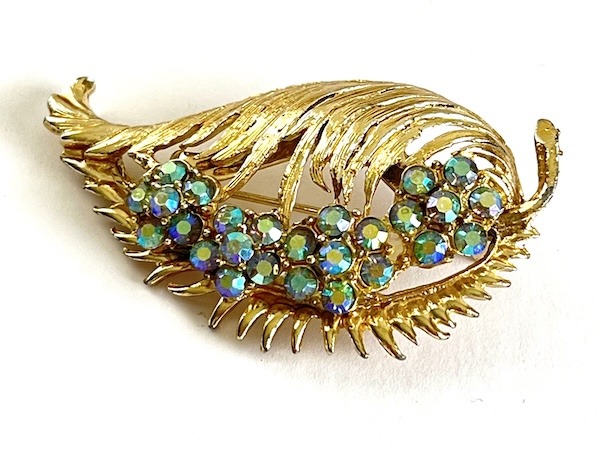 Popular items are often copied, that’s a fact of life. This brooch is one of those items that was copied from the original. There are subtle differences, enough to notice that it’s not the original, but to the untrained eye, still a lovely piece at a lower price. We could go on a rant about knock off items elsewhere, but not here. So for today, note that this brooch is NOT an original Coro Pegasus Leaf brooch, but reproduction by an unknown maker. Still lovely, still just as wearable, without the marking and most likely not quite up to Coro’s higher standards.