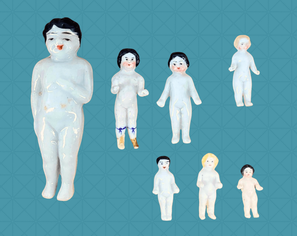 You can find Frozen Charlottes that have a glazed and finished front with an unfinished stoneware back. These were meant to be used in the bath. Some of them came with tiny bathtubs. The unglazed stoneware back allowed them to float in the water. Another use for them was to bake them into a cake, similar to the Mardi Gras tradition of King Cakes. It was considered a treat to be found as a tiny gift.