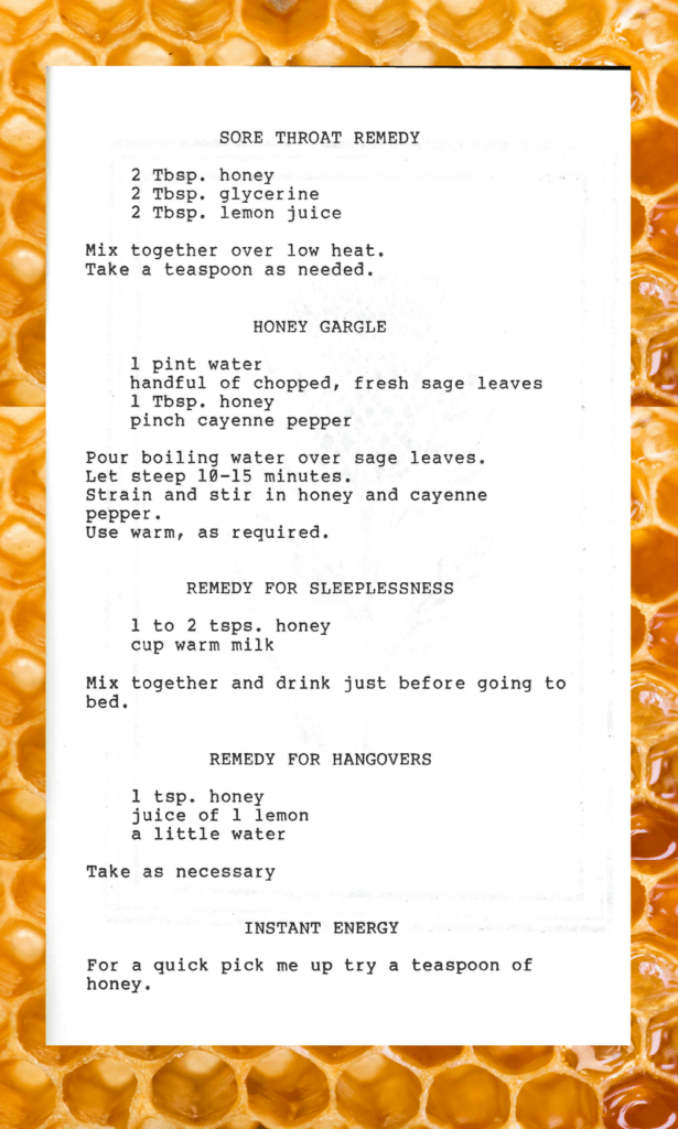One of the most interesting sections is the home remedies. Not the “bury it and let it ferment for 2 new moons” kind of remedies, but the uses-things-in-the-kitchen kind of remedies for common ailments like sore throats. My mom would give me spoonfuls of honey and lemon when I had a cold and was unquestionably being over dramatic about it. (FYI Honey is not safe for babies!) And there is actual scientific research that leans towards honey being helpful in finding cold relief.