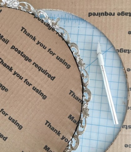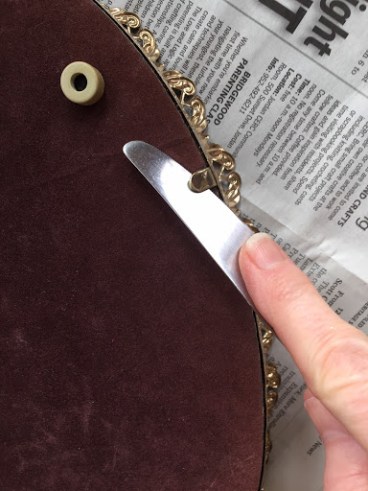 Mirrors are held in place with either a sliding backer card as in a picture frame, small metal flanges or small brass pins. Pry the flanges carefully and avoid bending them back and forth as they will weaken. Set aside the small pins. (I line them up on a piece of adhesive tape to keep track.) You’ll want to replace any backer card that is heavily damaged or mildewed with new cardboard or cardstock. The old mirror may hold a clue to the age of the vanity tray as they sometimes have a date and manufacture stamp. For instance, this one was made in Chicago by Ronco Glass in 1970.