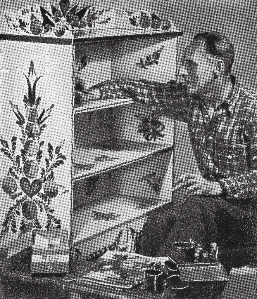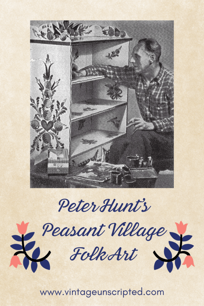 Artistically, Hunt’s mission was to make dull or outdated things charming, drawing inspiration from the folk art of the Pennsylvania Dutch as well as French, Scandinavian and Bavarian folk art, but giving it his own unique spin. Unlike some artists who carefully guard their style, Hunt encouraged everyone to give it a try, publishing Peter Hunt’s How-to-do-it Book in 1952. In a booklet called Transformagic (1955), he said “The important thing is to have fun! Let yourself go; enjoy it.”