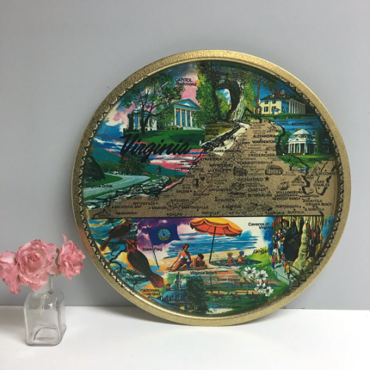 I have a penchant for vintage USA road trip souvenirs. These two 1960s round metal trays caught my eye at the local thrift, two retro lovelies nestled in with the ubiquitous Norman Rockwell and other collectible plates. And lovelies they are: Hawaii and Virginia trays in good condition with enthusiastically colorful art and something else I’d never seen on a travel souvenir, a signature. Ken Haag.