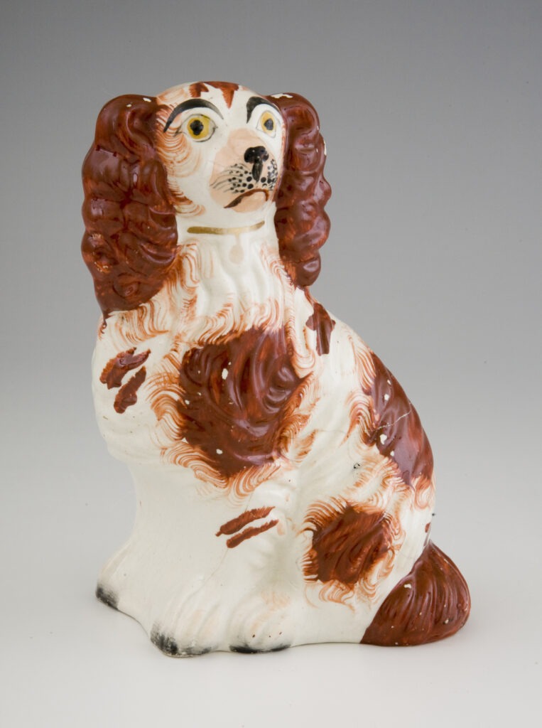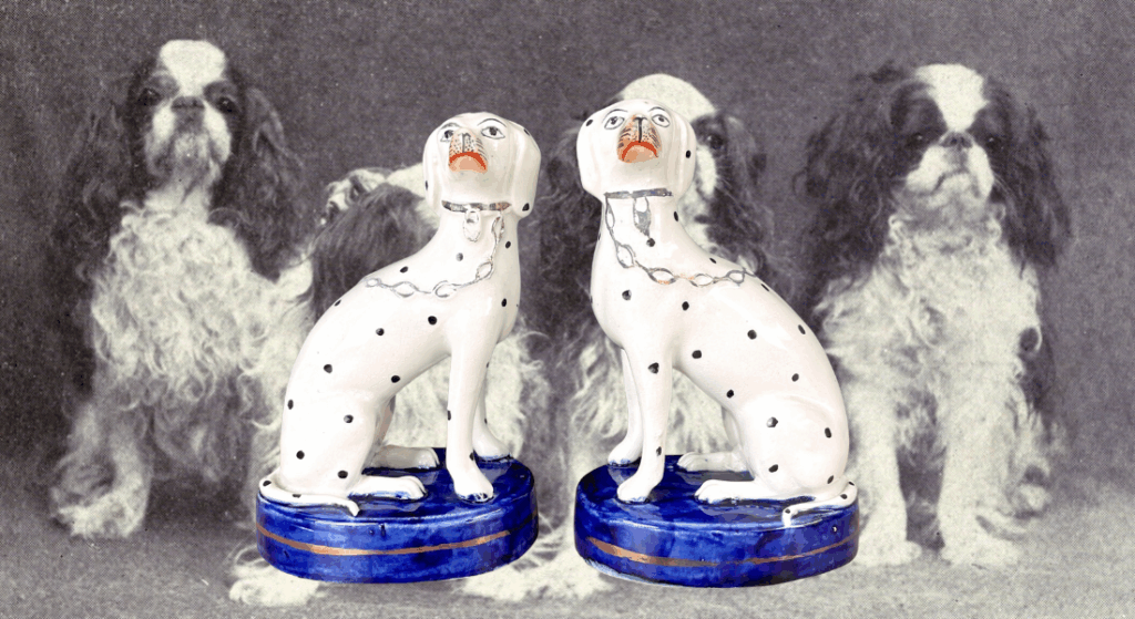 The popularity of pairs of dogs is attributed to British Royalty’s fondness for spaniels throughout the 1600s, spurred on by King Charles. By the 1800s, Queen Victoria kept dogs, one of which was a spaniel, and popularity surged once again. By this time Staffordshire pottery had become hugely popular and the dogs were found on fireplaces throughout the British Empire. They had become fixtures in most homes as they were affordable and readily available. These were the Victorian version of kitsch and knick-knacks.