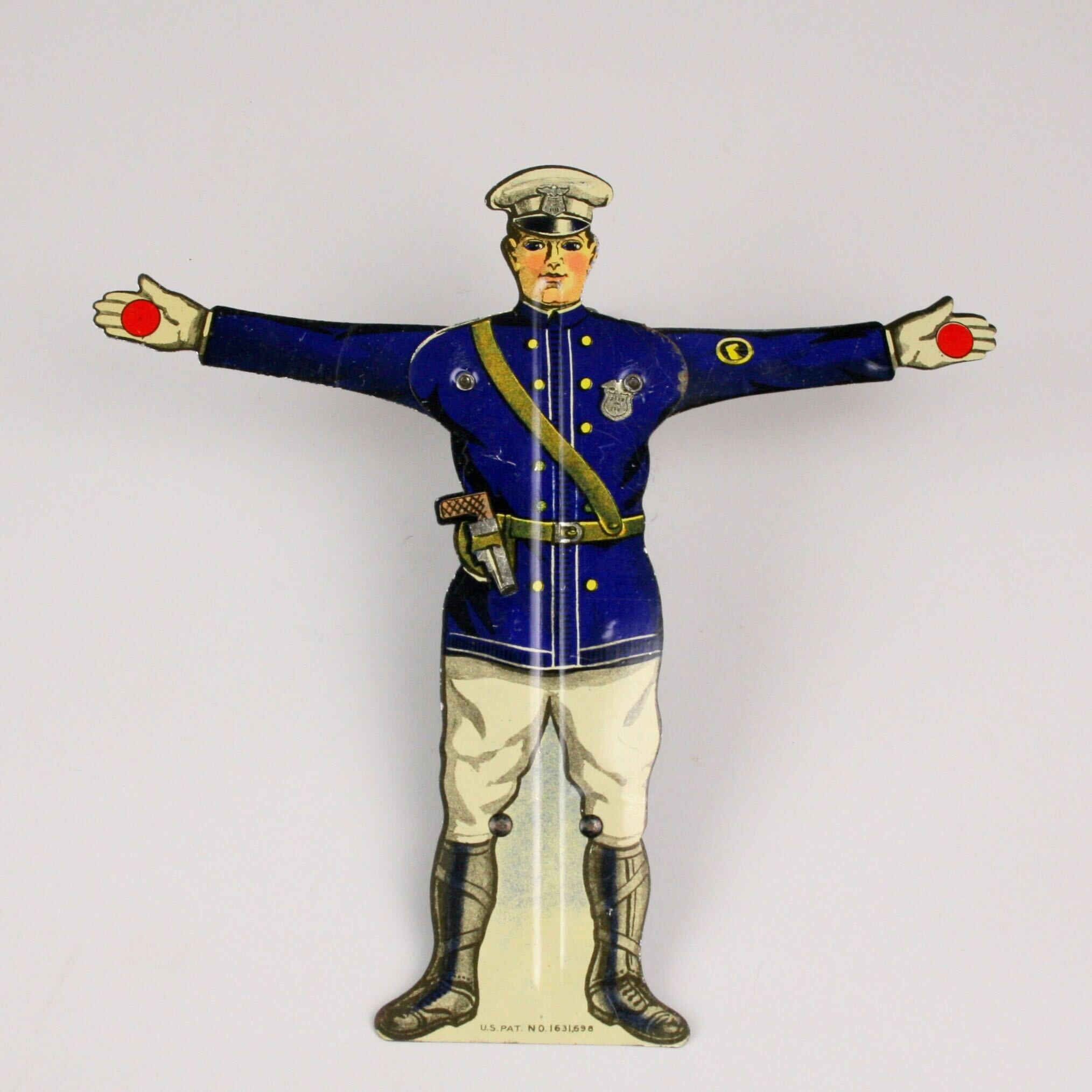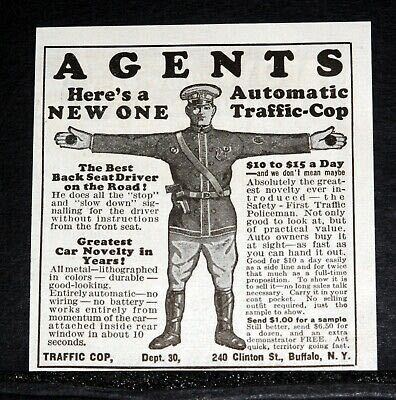 This 1920s automated tin traffic cop was listed by me and sold in a heartbeat. The advertisement explains how it is used on the rear window of the car and is activated by momentum to warn the car behind when the driver brakes or slows down. It was made in Buffalo, NY.
