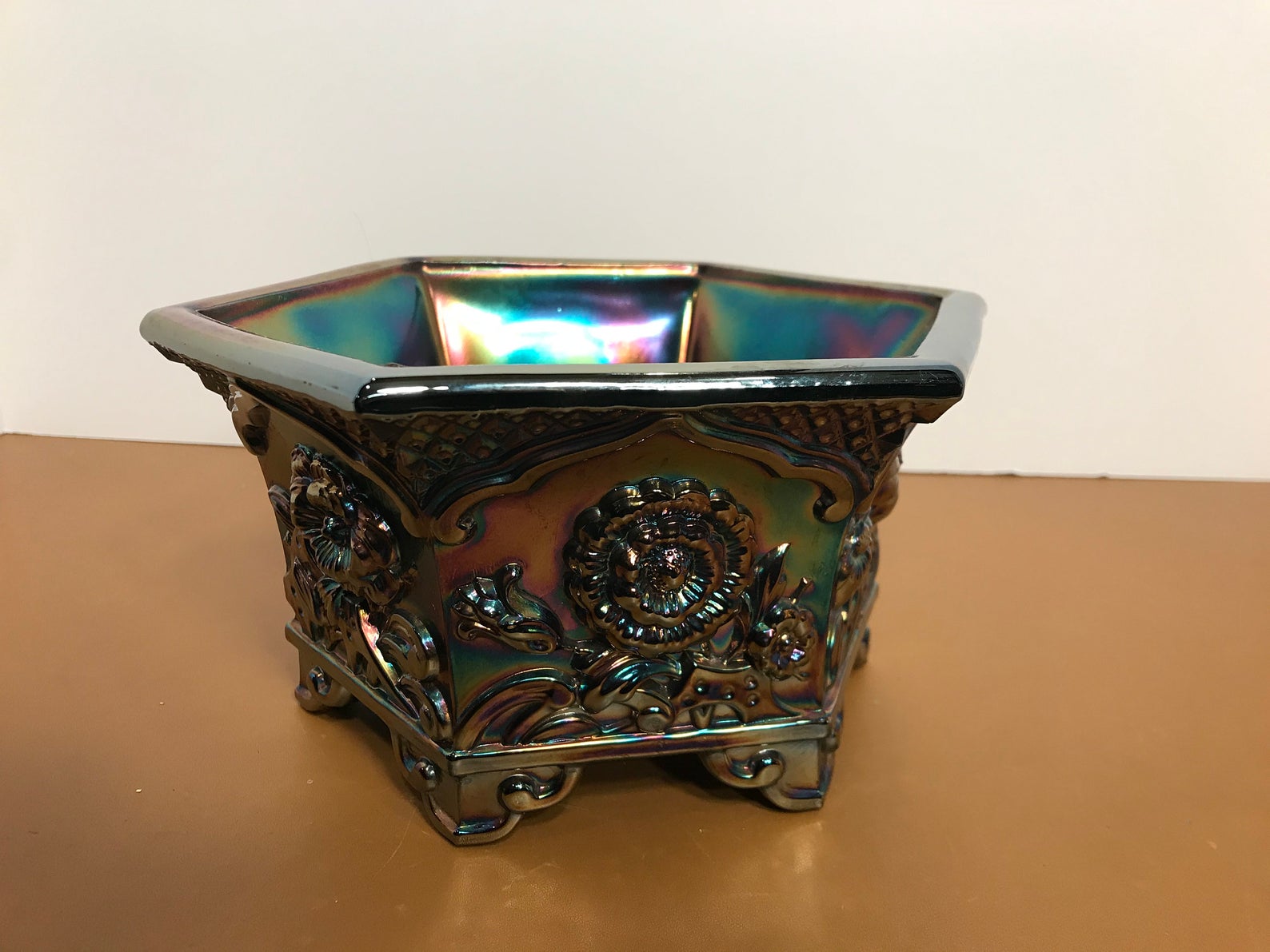 The Fenton Hexagon flower bowl repro was from their Original Formula Carnival Glass line, introduced in 1970 when Fenton first began applying a Fenton logo to their glassware. It was sold with this hang tag attached.