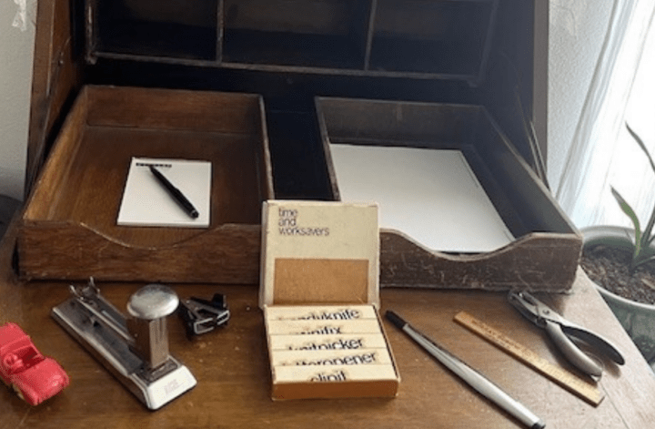 Before everything was made of plastic, we had heavy duty metal staplers, tape dispensers, and wooden paper trays. Typewriters sat on rolling tables that could be opened up to lay out the many pages to be typed up. If you were in need of a copy, you could slip a piece of carbon paper between two pages before typing. If you made a mistake, a bit of liquid paper would do the trick, but don’t forget to let it dry before typing over it. Hopefully you didn’t run out of ink or you may have to figure out how to change the ribbon. That could get messy if you weren’t sure how to do it. Before electric typewriters came along, they were manual, which meant striking the keys was anything but a light touch. I still remember taking typing class in school. The point was to look at the paper you were copying from and not the keyboard and type as fast and accurately as possible. Needless to say, it was not my best grade.