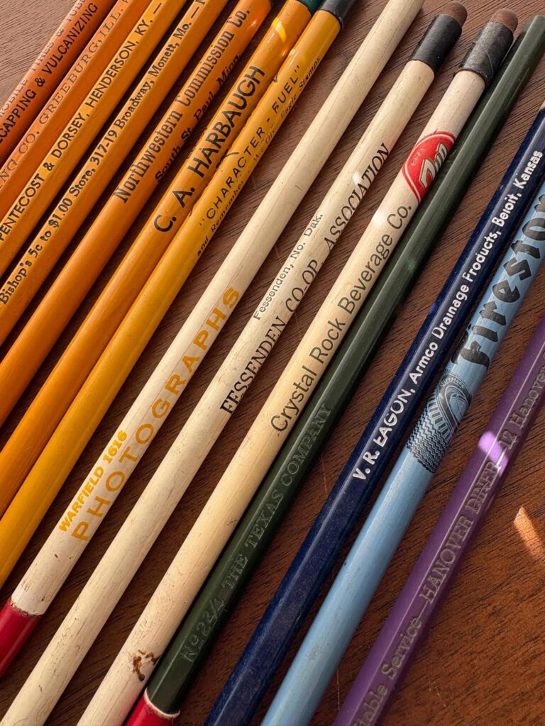 Vintage 1940s WWII advertising pencil collection highlighting local businesses, $28.50, available from Sasparilla Smile.