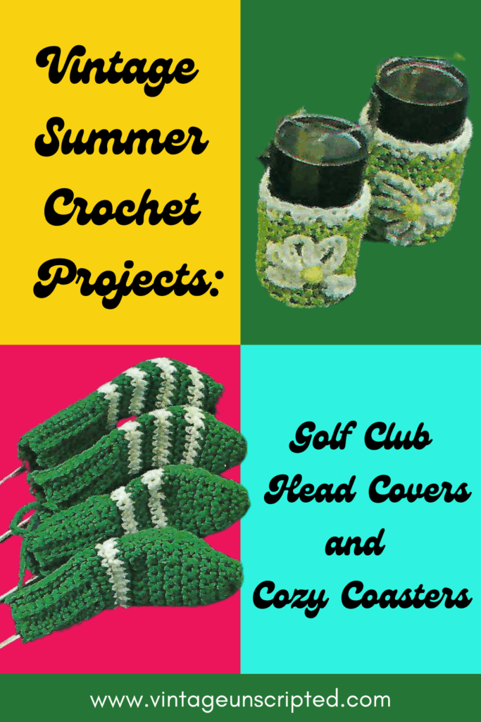 What could be a more perfect vintage summer crochet project than these two projects: cozy summer coasters, pictured below the Weintraub’s price tag, and golf club head covers below them. Both are easy to whip up and stinkin’ adorable.