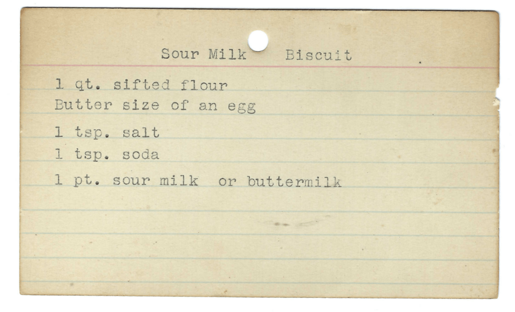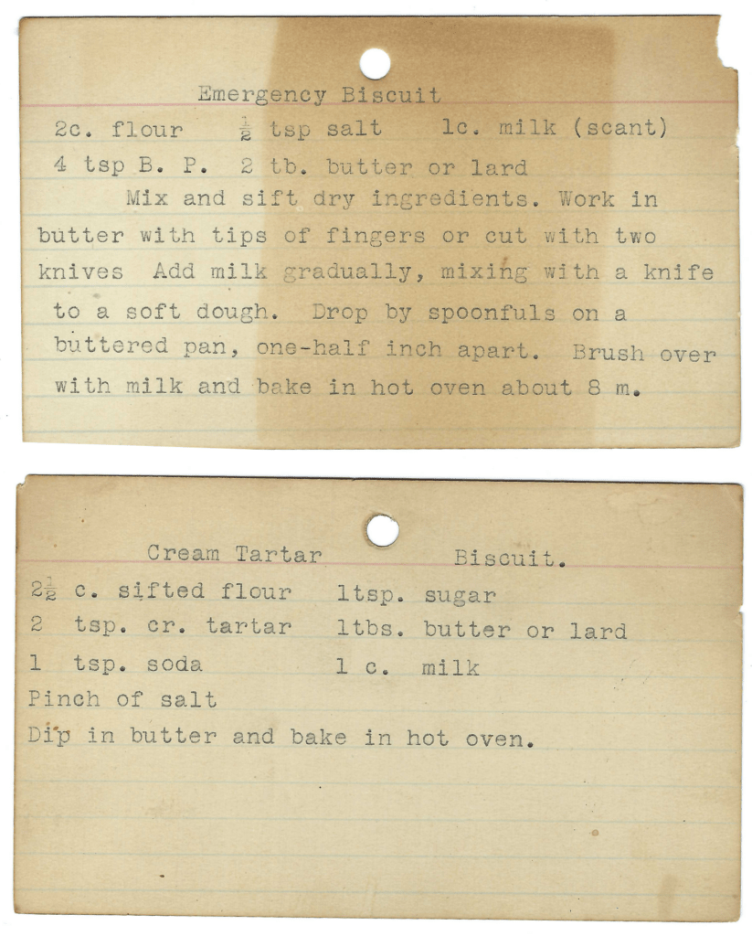 And finally, this recipe box was assembled by an awesome person. We know this because there are three biscuit recipes. Anyone who loves a good biscuit that much is automatically awesome. She also knew her way around biscuit making because two of the card don’t have instructions. (A hot oven is 450.°)
