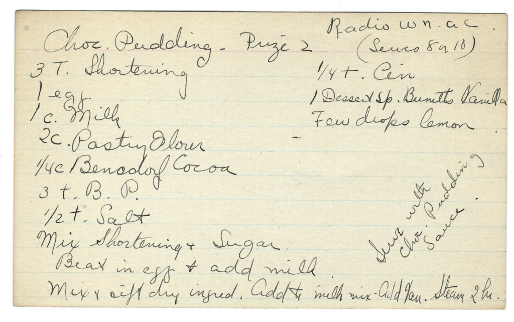 Which station it is can be narrowed down by a second clue. The recipe calls for Bensdorf cocoa, which is actually Bensdorp cocoa. If you were copying down the recipe from a radio announcer, it would be easy to mistake an “p” sound for an “f.” Bensdorp Royal Dutch Cocoa had to stop exporting to the US in 1940 when the Nazis invaded the Netherlands, and did not resume until the late 1940s-early 1950s when production was back up to scale. So most likely the WNAC in question the earlier of the Boston radio stations.