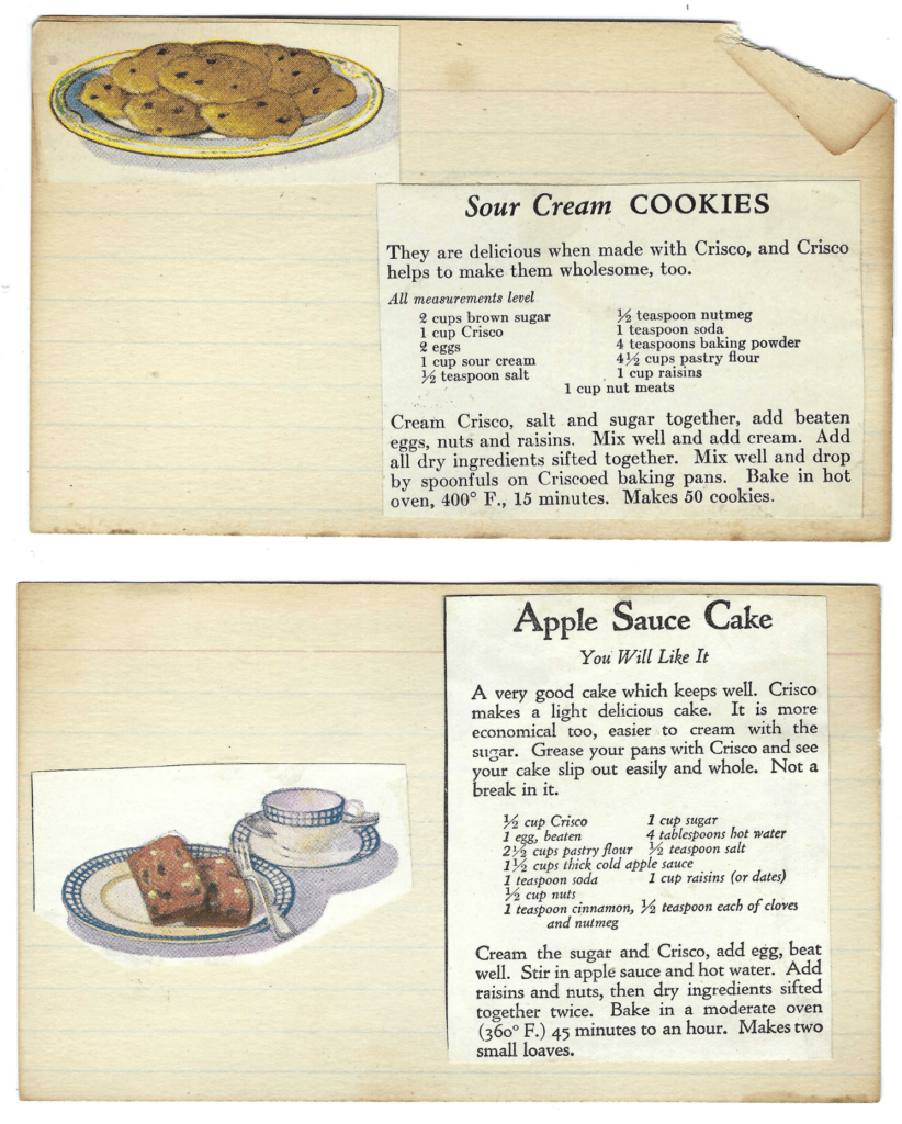 Clue 5: There are Crisco promotional clipped recipes. They didn’t match the style and type from any of the vintage Crisco booklets for sale online (yes, I am that deep in this rabbit hole). And they also don’t seem to have been printed on both sides, meaning it’s unlikely they are from a booklet or a magazine. Looking at the china patterns in the drawings, I’m guessing they are from the 1930s-1940s.