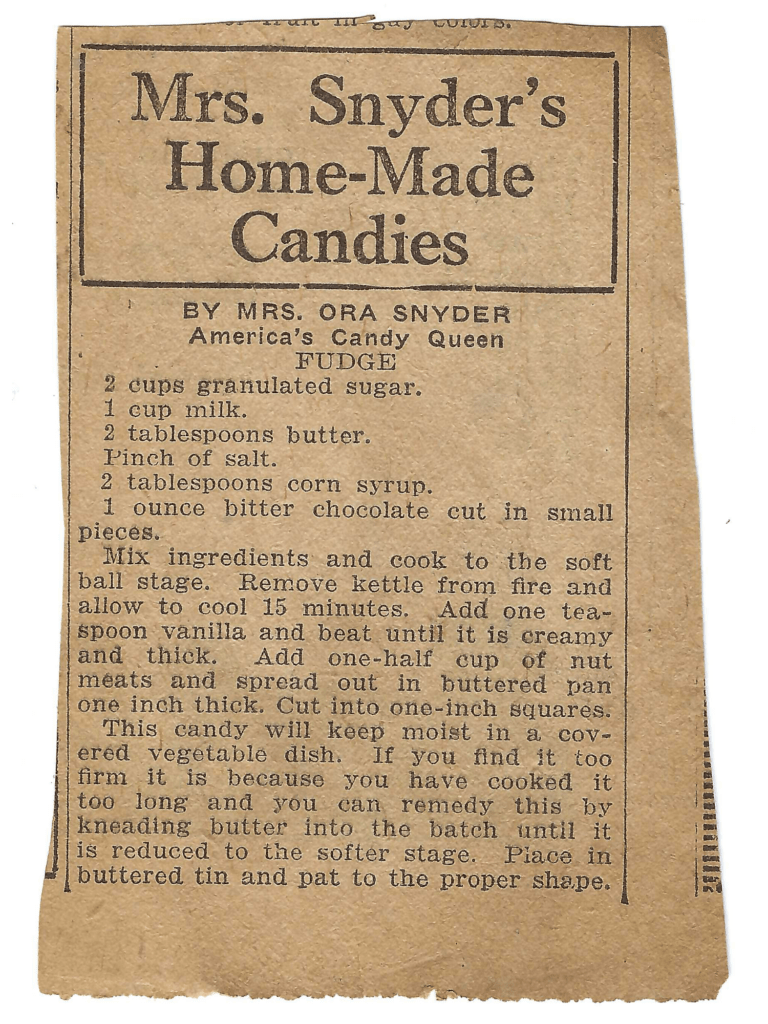 Clue 5: There is a newspaper recipe for fudge by Mrs. Ora Snyder, an Chicago confectioner who was an absolute girl boss from the 1920s until the 1940s. (It was hard not to set this post aside and start one about her.)