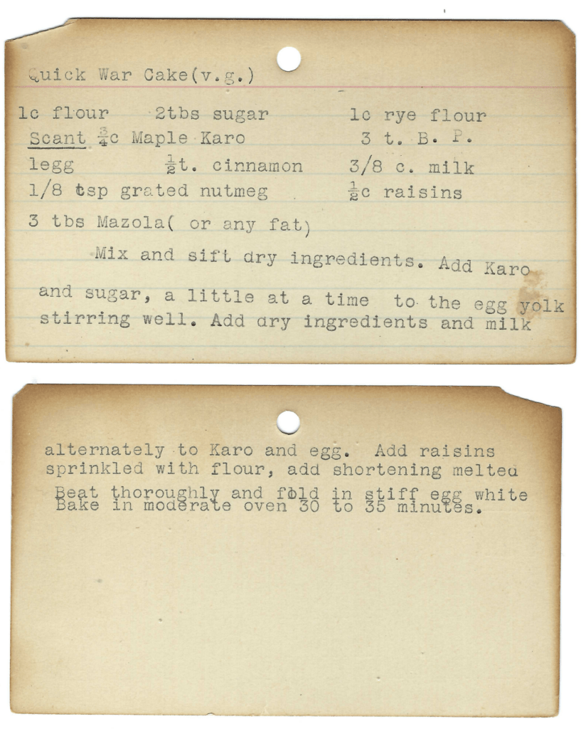 Clue 1: Box has two recipes for War Cakes, one of which is below. Because of food rationing, recipes were created that minimized the use of margarine, butter, sugar and eggs.