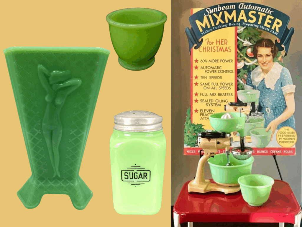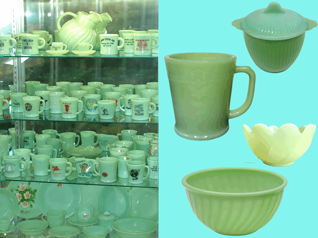 This paragraph is for us “How it’s made” nerds. Jadeite glass is a soda-lime glass. 90% of the window glass and glass containers in the world are made from soda-lime glass. The lime, by the way, is calcium hydroxide–a white powder that has nothing to do with limes or the green color. Colorants included chromium oxide, copper oxide and, in pre WWII McKee and Jeannette jadeite, uranium oxide. (One of the ways to test early jadeite is to stick it under a black light and see if it fluoresces.) Opacifiers like titanium dioxide, bone ash and fluorides were also added.
