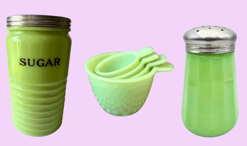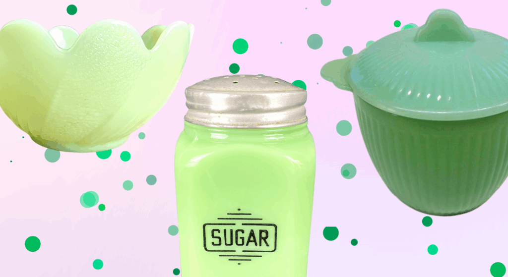 Jadeite is an opaque milky green glass that was made from the 1930s-1960s. The three key makers were the McKee Glass Company and the Jeanette Glass Company, both located in Jeanette, PA, and both producing jadite starting a year apart in 1931 and 1932. Anchor Hocking, located in Lancaster, OH, began producing their legendary Fire King Jade-ite in the 1940s. Fire King is by far the most common maker you’ll find in the wild.