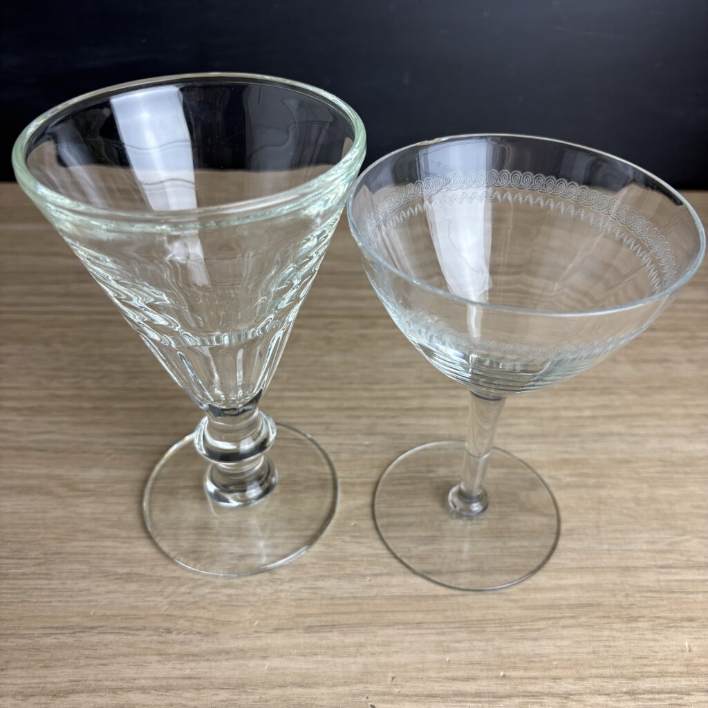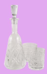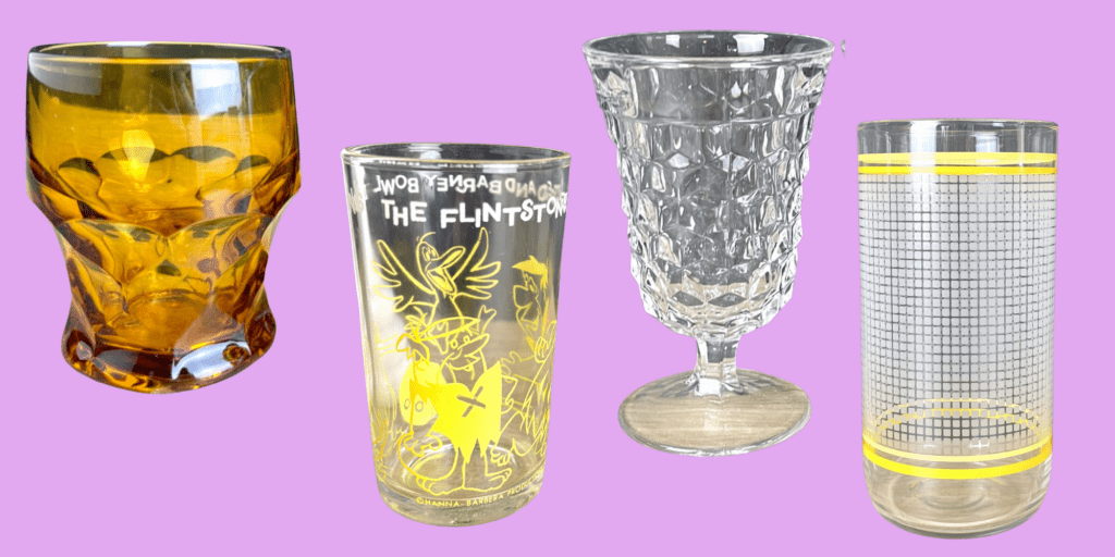 Glass defined is an amorphous, aka non-crystaline, clear solid made by fusing sand/silica and other chemicals depending on what type of glass you’re making. Not all glass contains silica, but the kinds of glass that vintage sellers and vintage lovers are going to come across does. The most common types of glass used for drinkware are: soda-lime, which is cheap to make and shatter resistant; borosilicate glass, which is resistant to fast temperature changes (Pyrex); crystal, which has minerals that make it brilliant, clear and thin; and tempered glass, which is heat treated making it stronger than regular glass.